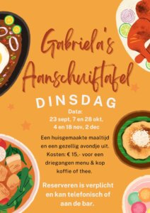 Gabriela’s Aanschuiftafel is dé manier om elkaar te ontmoeten en te genieten van een heerlijke, huisgemaakte maaltijd. Tijdens de avonden op 28 oktober, 4 en 18 november staat een driegangenmenu op het programma, inclusief koffie of thee.